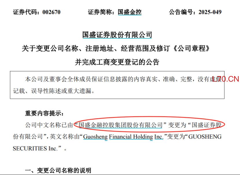 10月26日晚期货投资信息中心,国盛金控(002670)发布公告称,公司中文名称已由“国盛金融控股集团股份有限公司”变更为“国盛证券股份有限公司”。公司已于10月24日完成公司名称、注册地址、经营范围的变更登记手续与修订公司章程的备案手续,并取得南昌市市场监督管理局核准换发的《营业执照》。