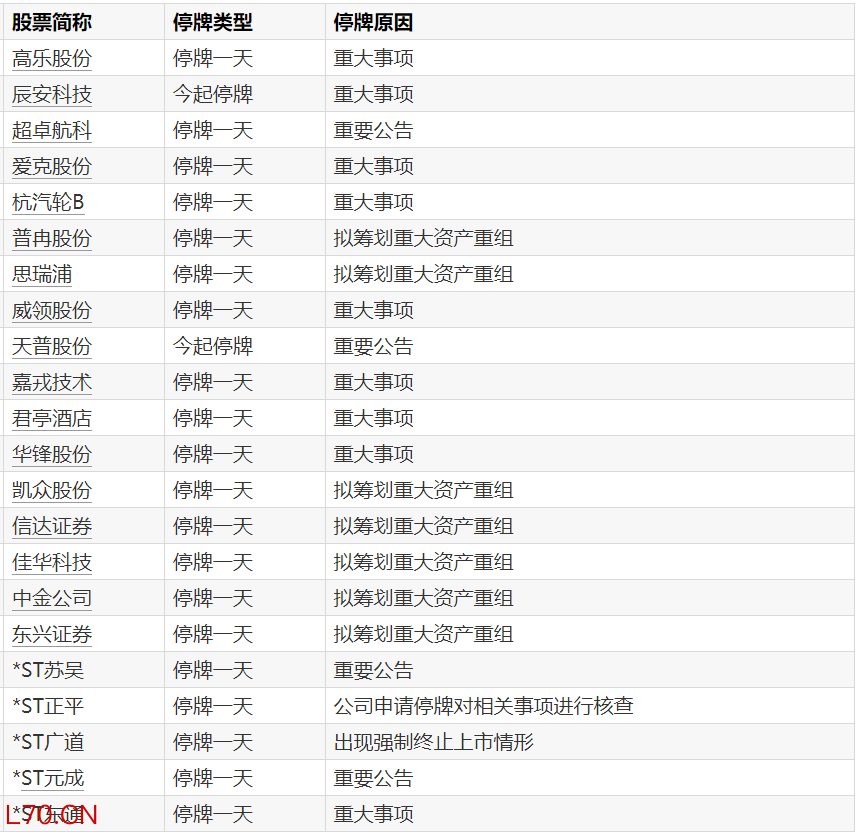 A股停牌提示:22股今日停牌