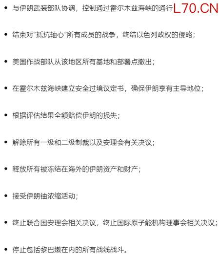 从公开新闻披露的伊朗方面提交的十点计划细则中来看,大致可以分为三块,分别是:1. 对霍尔木兹海峡的控制权;2. 完全停战与解除所有制裁;3. 铀浓缩。