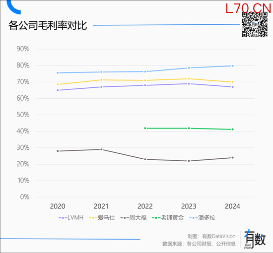 银饰品牌潘多拉的毛利率长期稳定在75%以上,一度接近80%,不仅金饰和钻石难望其项背,奢侈品品牌也甘拜下风。