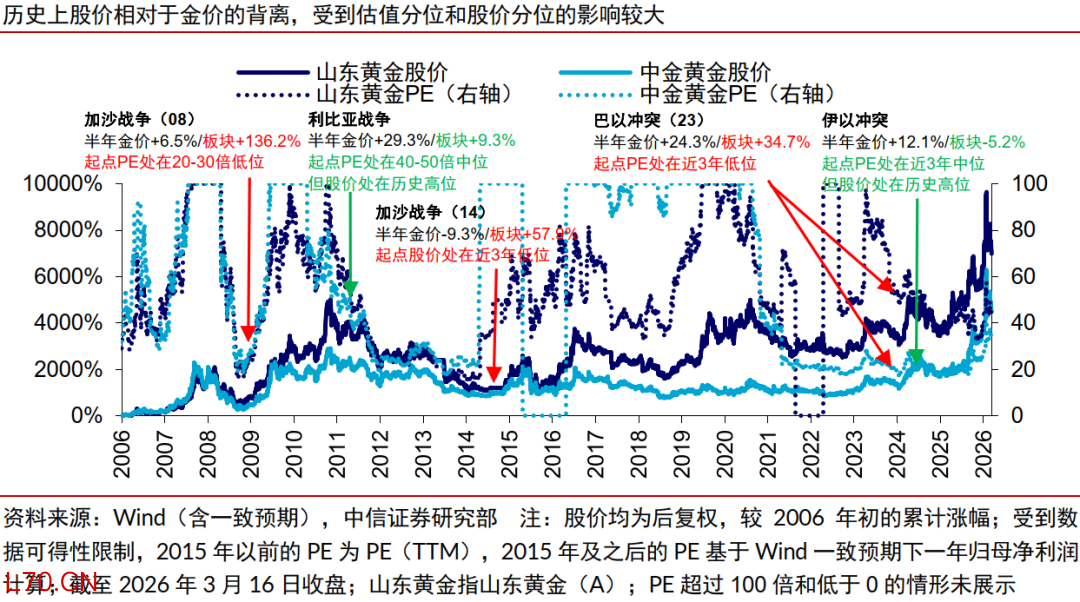 中信证券发布研报称,历次中东冲突后,金价的中期走势仍取决于美元信用和流动性因素。展望本轮冲突,预计流动性宽松以及美元信用弱化两大趋势的延续将继续推升金价。历史上估值或股价分位的优势会强化黄金板块的上涨空间,而当前头部公司PE估值水平回落至15-20x的历史低位,同时考虑到近年来股价高点和金价高点高度同步,中信证券看好金价新高推动的股价新高。