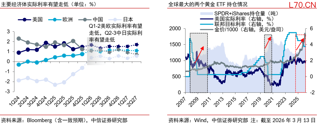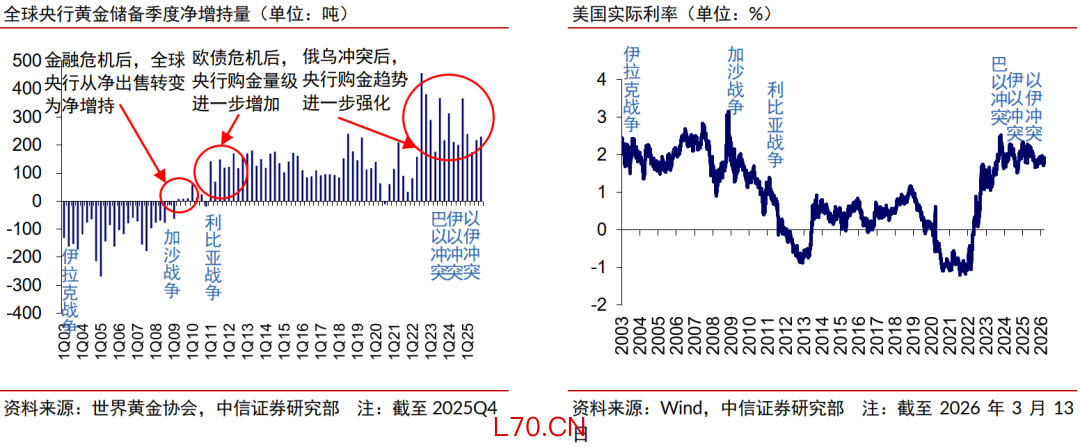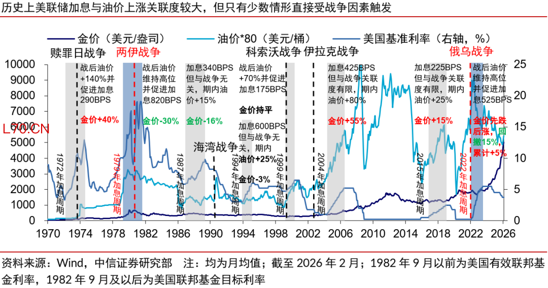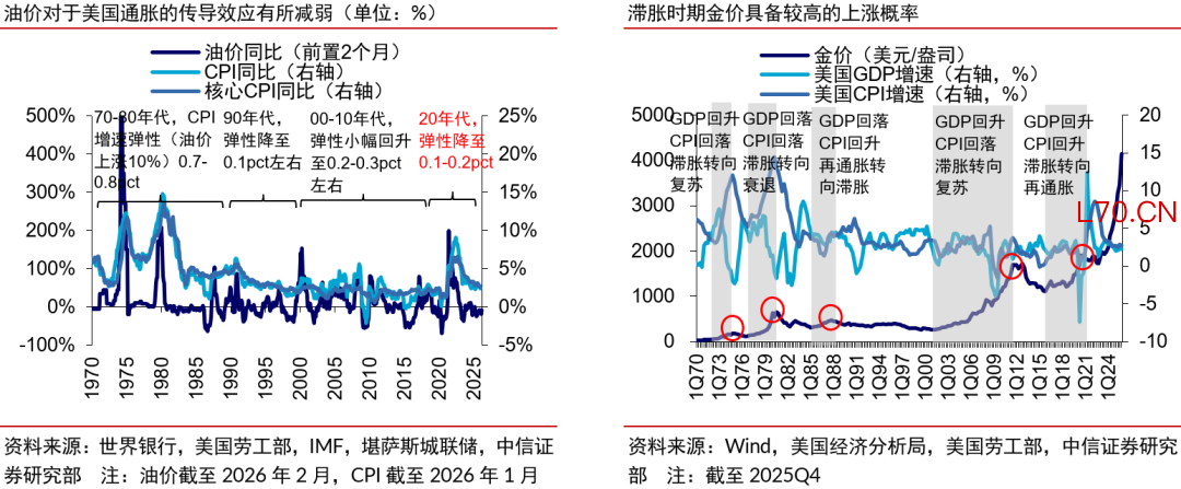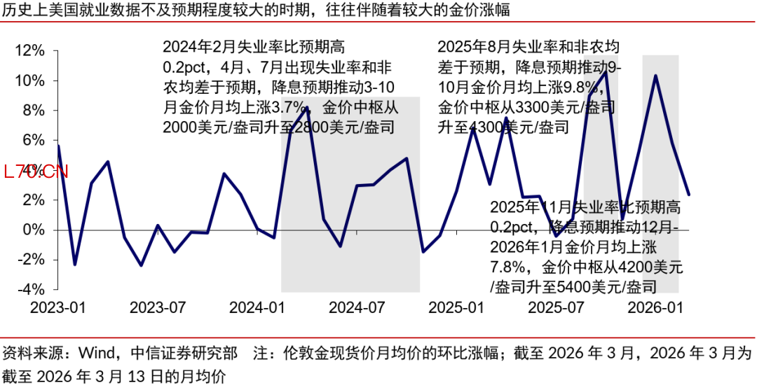 1)一是流动性宽松通道不改,“类滞胀”担忧提供潜在催化。近三年美国就业不及预期程度较高的时期,金价通常加速上涨,包括2024年3-10月、2025年9-10月和2025年12月-2026年1月。2026年2月美国非农和失业率数据罕见地再次共同指向美国就业走弱风险,有利于市场降息预期升温,我们预计沃什担任美联储主席后全年仍有1-2次25bps的降息,流动性宽松通道不会反转。叠加关税、原油对于美国通胀的影响滞后体现,Q1-3主要经济体的实际利率有望相继走低,有助于ETF增仓并利好金价。历史上仅有两次战争(两伊战争、俄乌战争)后的油价上涨使得美联储转向紧缩,并导致金价下跌,战争爆发时均美国通胀均具备本就高企的特征,而当前的静态通胀水平与油价传导幅度均已大幅降低,且美国的政策导向也存在较大差异。考虑到历史上美国滞胀时期的金价上涨概率较大、涨幅较高,当前美国经济“类滞胀”风险加剧,对金价有潜在利好。