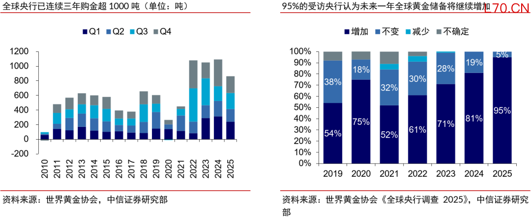 2)二是美元信用弱化趋势延续,“美债担忧”溢价有望强化。世界黄金协会数据显示,俄乌冲突以来,“去美元化”趋势促进全球央行购金潮延续,2022-2024年均净购金量超千吨,2025年维持863吨高位,本质原因在于市场对于美国在美债问题、对外频繁涉及以及对内机制运作方面的担忧不断升温,这一趋势有望延续。历史上美债法定上限上修以及美债规模突破法定上限后的半年内,金价平均涨幅分别为4.4%/11%。当前美债上限的财政约束效应显著削弱,“上限不断上修-持续被突破”的无限循环有望带动金价持续上涨。参照金融危机后金价在美元信用弱化背景下相对于美债规模的“超涨”程度,我们测算当前金价合理位置达到5000美元/盎司以上,而美元信用弱化、流动性宽松以及避险情绪三方因素的叠加有望助力年内金价迈向6000美元/盎司。