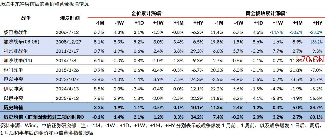 历次中东冲突爆发后,中信黄金指数短期涨幅有限,但半年度涨幅平均达到35%,在金价利多因素较为集中的时期则达到60%。