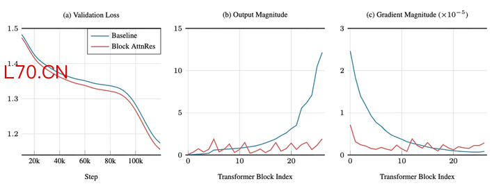从训练过程来看,基线模型的各层输出数值随深度单调增大,印证了 PreNorm 稀释问题;而 AttnRes 的各层输出数值在块边界处得到重置,呈现周期性变化,各层梯度分布也更加均匀,说明更多的层真正参与到了有效的学习中。