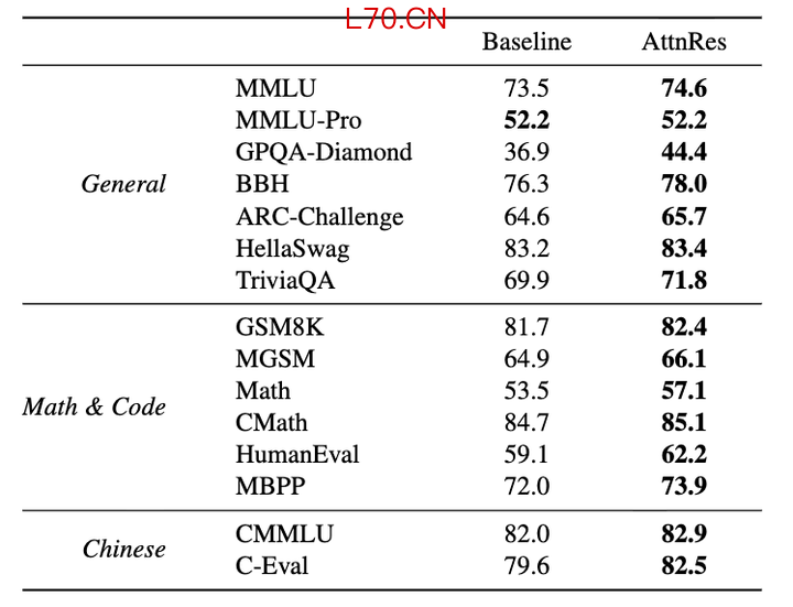 结果发现,标准残差连接偏好「更宽、层数更少」的模型,而 AttnRes 的最优点偏向「更窄、层数更多」的模型。这说明 AttnRes 能够更有效地利用深度,让每增加一层都真正产生价值,而不是让深度变成一种边际效益递减的堆砌。