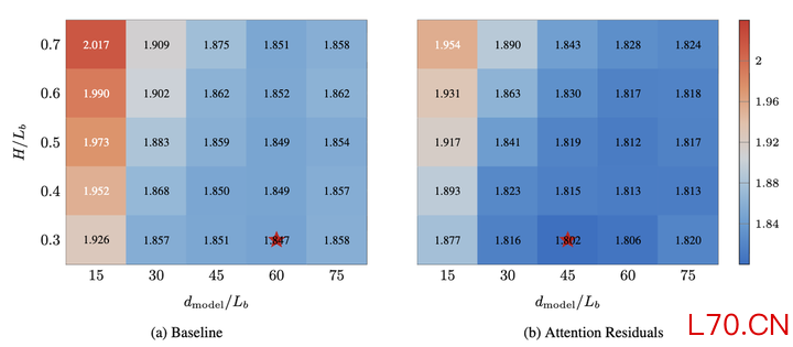 AttnRes还带来了一个对未来模型设计有参考价值的发现。研究人员在固定总计算量和参数量的前提下,枚举了 25 种不同的深度与宽度组合,对比基线模型和 AttnRes 各自偏好的最优架构。