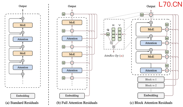 具体做法是,给每一层配备一个小小的「查询向量」,就像给每道工序的工人配了一张需求单。工人在开工前,先拿着需求单去翻所有前面工序的产出,根据相关度算出一套取用比例,再按这个比例把需要的原料混合起来。