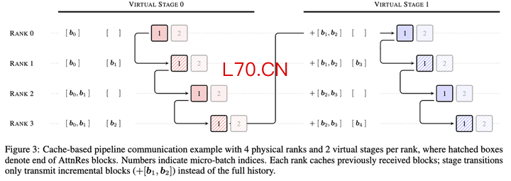 训练端设计了跨阶段缓存机制,在流水线并行训练中每次切换阶段时只传输新增的那一小部分块数据,而不是每次都把全部历史重新传一遍,实测整体训练额外开销不超过 4%。
