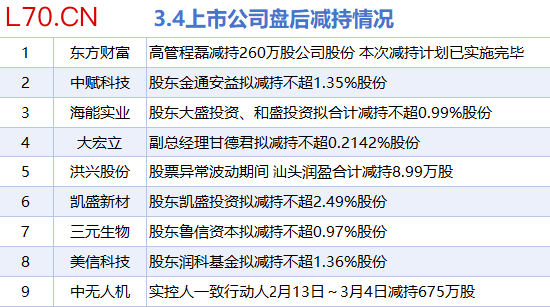 3月4日增减持汇总:中国海油等4股增持 东方财富等9股减持(表)