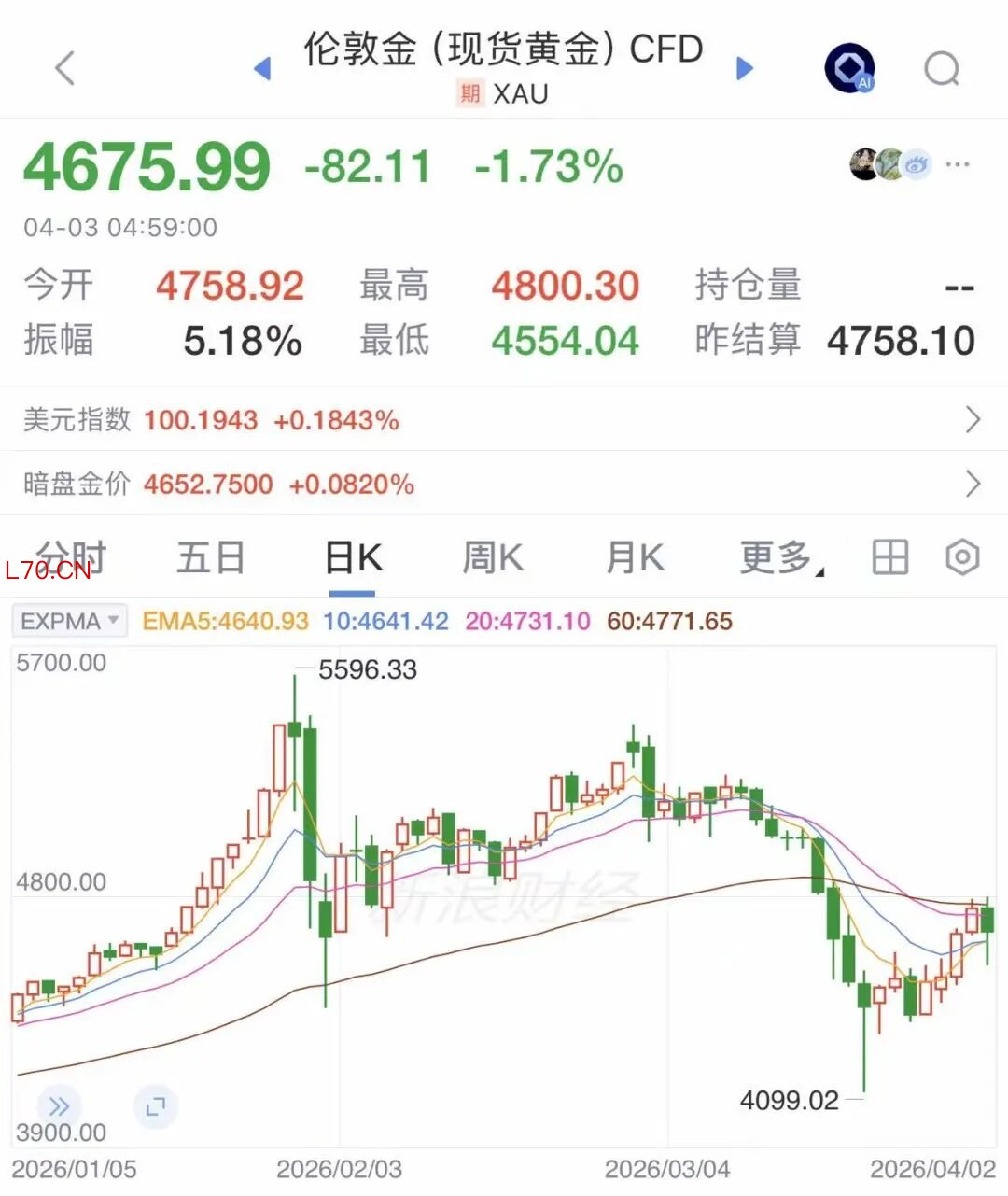 自美以袭击伊朗引发中东战事以来,国际金价剧烈震荡,截至最新收盘,现货黄金报4675.99美元,跌1.73%。