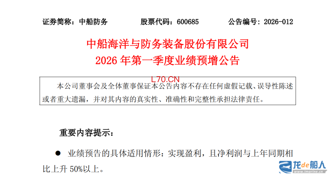 4月13日晚间,中船海洋与防务装备股份有限公司(以下简称“中船防务”或“公司”)发布《2026年第一季度业绩预增》公告。