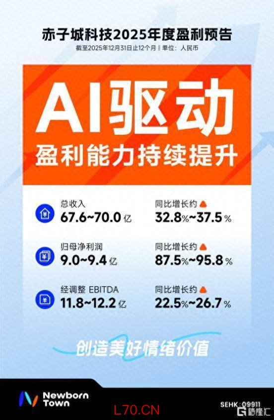 3 月 4 日,赤子城科技(09911.HK)发布 2025 年度盈利预告,公司营收实现快速增长,利润亦大幅提升。截至 2025 年 12 月 31 日止年度,赤子城科技总收入约为人民币 67.6~70.0 亿元,较 2024 年增长约 32.8%~37.5%;归母净利润约为 9.0~9.4 亿元,同比增长 87.5%~95.8%;经调整 EBITDA 约为 11.8~12.2 亿元,同比增长约 22.5%~26.7%。