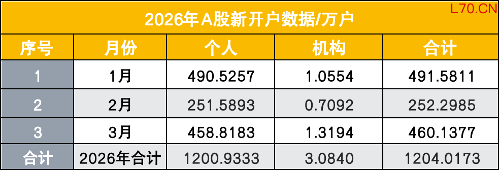根据最新开户数据,2026年3月,A股市场全月新开账户数达到460.14万户,其中个人投资者开户数为458.82万户。这一数字不仅较今年2月的252.30万户环比大幅增长82%,更相比去年3月的307万户同比增长了50%。