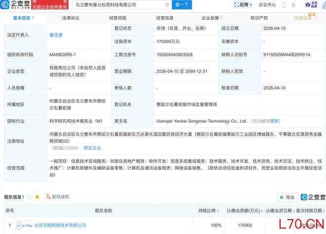 字节跳动在乌兰察布成立科技新公司,注册资本17亿